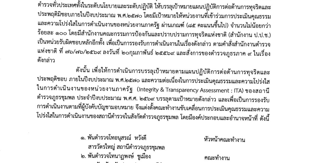 คำสั่งแต่งตั้งคณะทำงานติดตามผลการประเมินคุณธรรมและความโปร่งใสในการดำเนินงาน ของสถานีตำรวจภูธรชุมพล ประจำปีงบประมาณ พ.ศ.2569