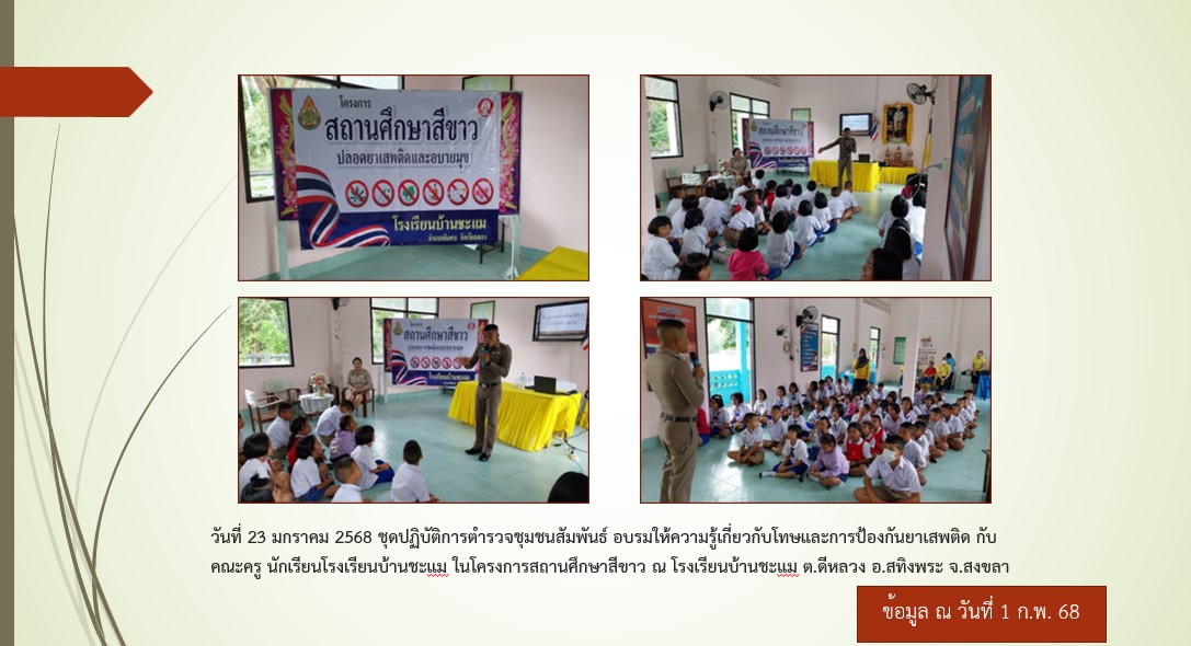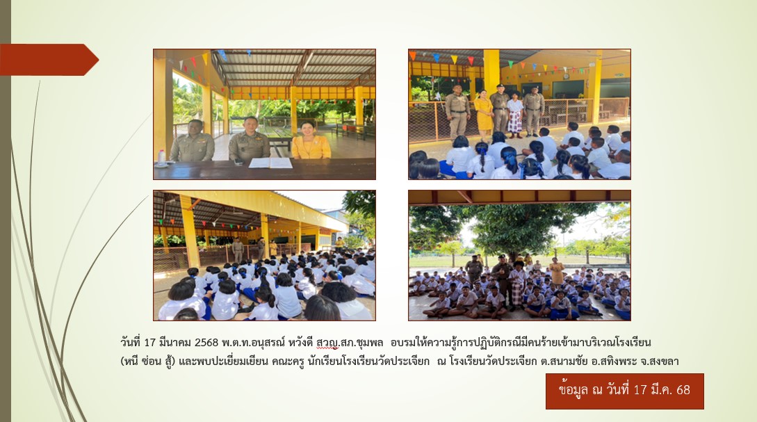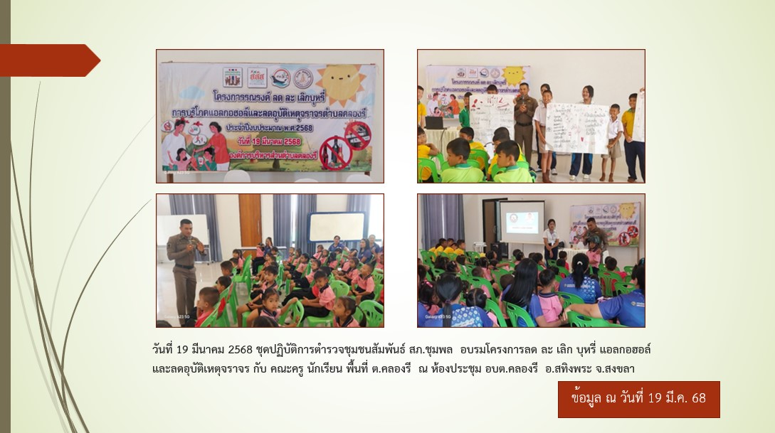 31 ธ.ค.68 พ.ต.ท.อนุสรณ์ หวังดี สวญ.สภ.ชุมพล ประชุมชี้แจงการปฏิบัติตามมาตรการป้องกันและลดอุบัติเหตุช่วงเทศกาลปีใหม่ แก่ รอง สวป.ฯ ร้อยเวร 20 หน.สายตรวจ ชุดสืบสวน และ หน.เวรอำนวยการ ปล่อยแถวออกปฏิบัติหน้าที่ตามแผนฯ ตั้งจุดตรวจ – จุดสกัด ร่วมกับภารกิจจิตอาสาอำนวยความสะดวกและให้คำแนะนำในการขับขี่เดินทางในห้วงปีใหม่แก่ผู้ขับขี่ พร้อมดำเนินการตามคำสั่งการผู้บังคับบัญชาที่ สภ.ชุมพล และออกปฏิบัติงานฯ บริเวณถนนเอเชีย 408 ต.ชุมพล อ.สทิงพระ จว.สงขลา