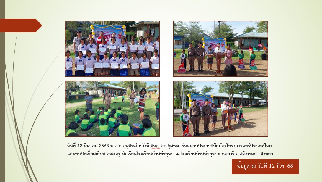 30 ธ.ค.68 พ.ต.ท.อนุสรณ์ หวังดี สวญ.สภ.ชุมพล ร่วมพิธีเปิดศูนย์ปฏิบัติการความปลอดภัยทางถนน อบต.ดีหลวง ช่วงเทศกาลปีใหม่ประจำปี 2569 ณ องค์การบริหารส่วนตำบลดีหลวง อ.สทิงพระ จ.สงขลา โดยมีนายอำเภอสทิงพระ เป็นประธานฯ